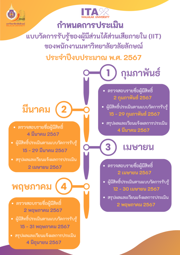 กำหนดการประเมินแบบวัดการรับรู้ของผู้มีส่วนได้ส่วนเสียภายใน (IIT) ของพนักงานมหาวิทยาลัยวลัยลักษณ์ ประจำปีงบประมาณ พ.ศ. 2567